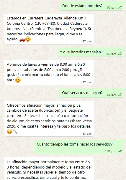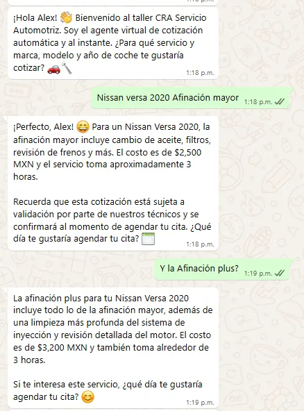 Entrenamos al Agente IA para entregar cotizaciones al instante para todos los servicios y paquetes de tu taller mecánico para cualquier marca y modelo de auto.