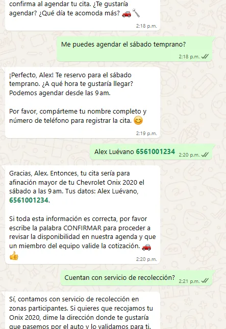 Serán 45 minutos, en los que charlaremos sobre ti, tu taller y evaluaremos si el agente IA puede apoyar a automatizar procesos y generar más citas de servicios. Resolveremos dudas, veremos cómo funciona y te explicaremos siguientes pasos para llevar a cabo su instalación.